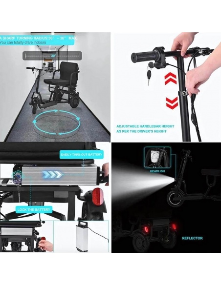 Trottinette électrique 3 roues pour PMR et sénior vous pouvez la pliez puis la divisée en 2 parties c'est ce qui la rend vraiment pratique. Équipée de pneu anti-crevaison Vitesse : 0-7km/h Autonomie : 20km environ