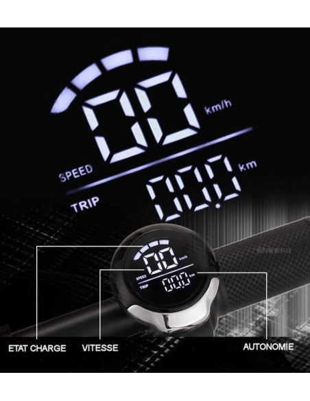 - Écran LCD affichant la vitesse et le nombre de km parcourus