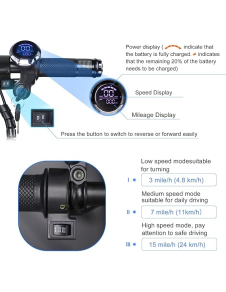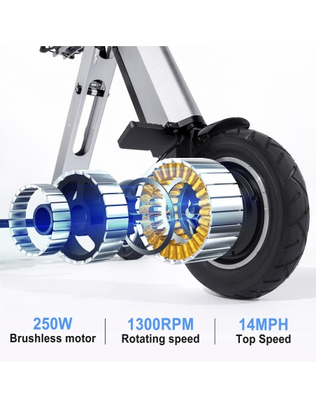 - Moteur Brushless de 250 watts : Puissant et durable, avec 3 vitesses réglables (dont une très lente pour accompagner une personne).