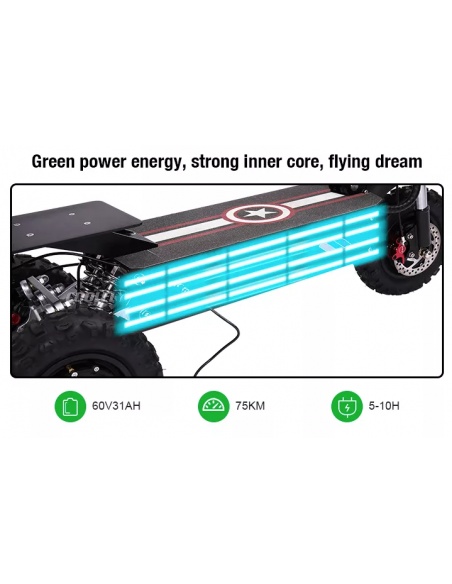Grâce à sa batterie performante 60V 31Ah, la Falcon offre une autonomie de 75 km. Que ce soit pour vos déplacements quotidiens ou pour des balades prolongées, elle est conçue pour vous accompagner sans interruption. Avec un temps de charge rapide de seulement 4 heures, vous serez toujours prêt à reprendre la route.