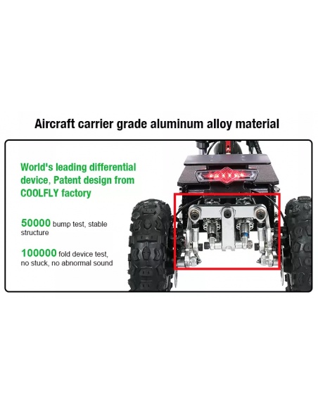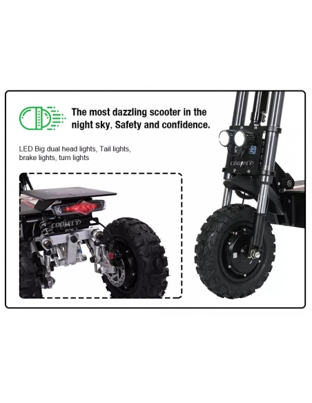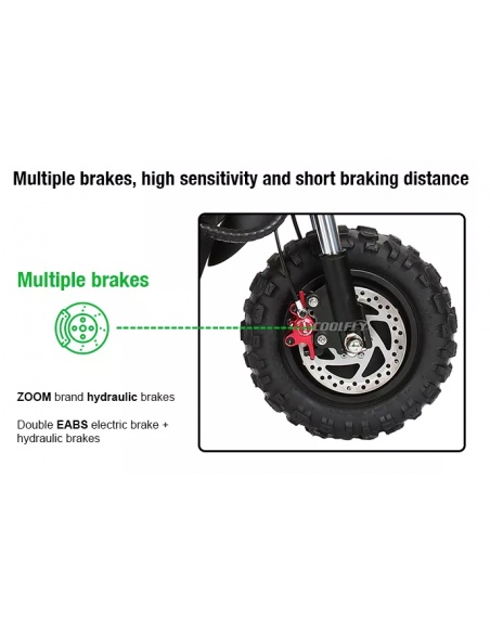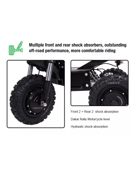 La Falcon est équipée de pneus tout-terrain de 11 pouces, spécialement conçus pour garantir une adhérence optimale, même sur les surfaces les plus difficiles. Ces gros pneus, associés à un système de suspensions renforcées (2 à l’avant et 2 à l’arrière), absorbent efficacement les chocs et offrent un confort de conduite exceptionnel.
